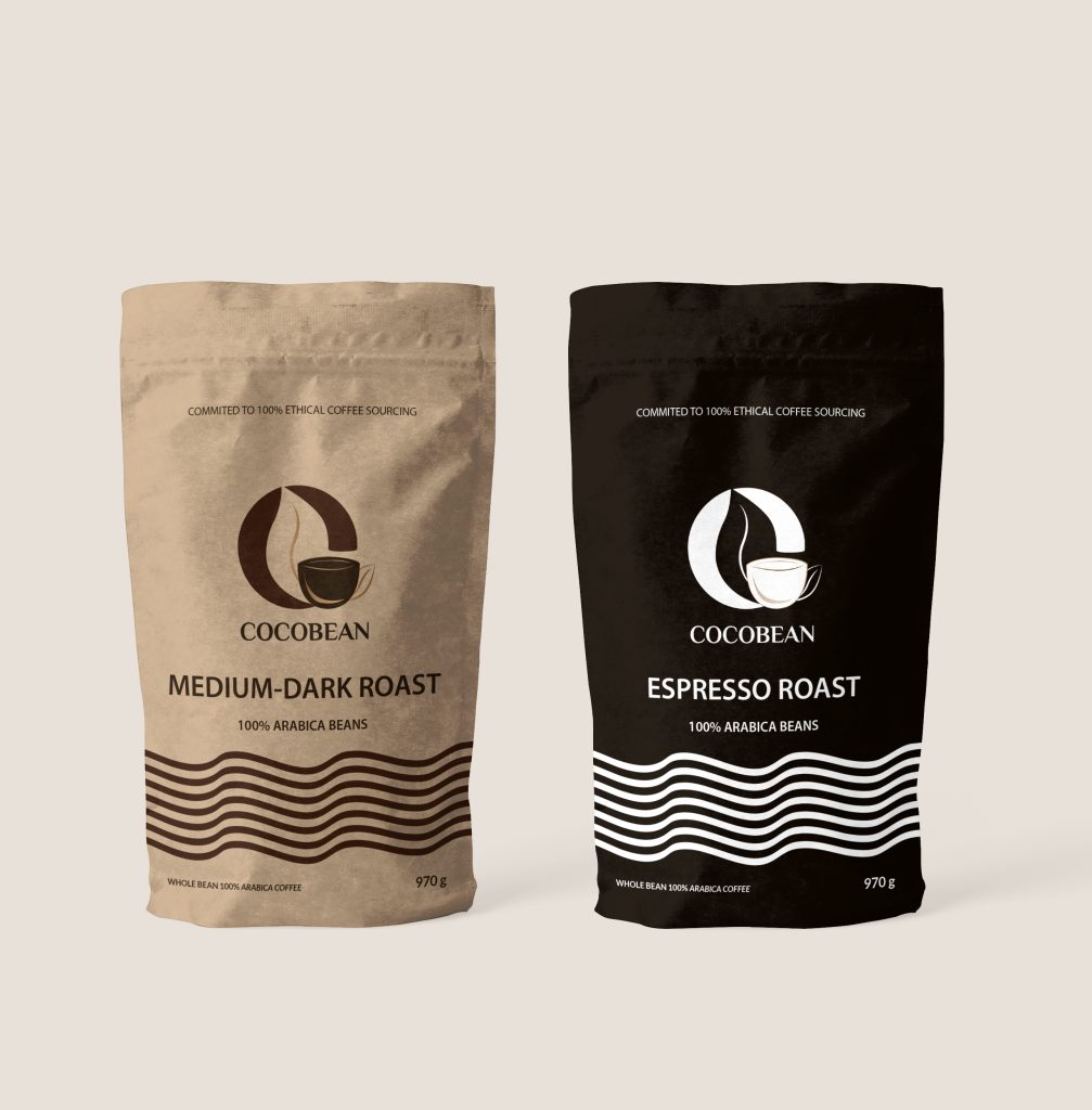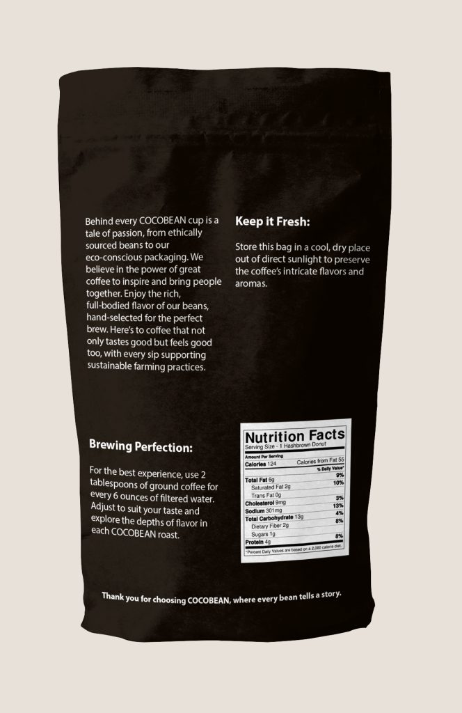 Here are the front and back designs of the COCOBEAN coffee bags: the front highlights the commitment to ethical sourcing, and the back offers brewing tips and freshness advice for the customers.